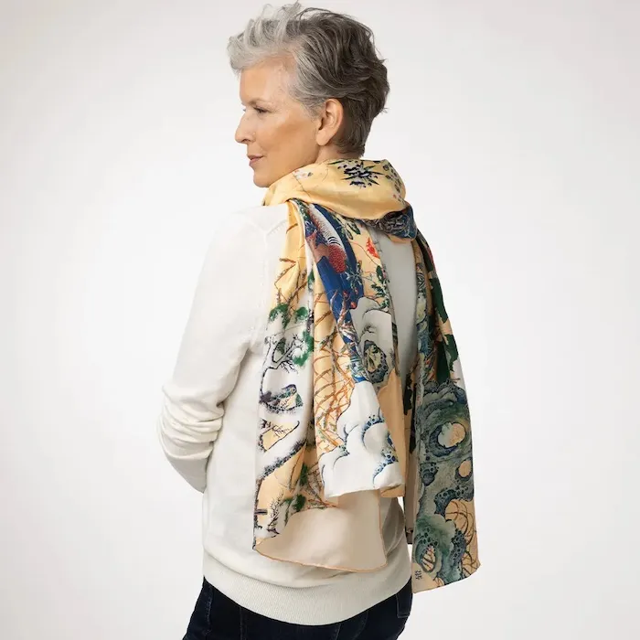 Un pañuelo 100% seda natural, con estampado exclusivo basado en textiles históricos africanos y cortes de sastrería clásica. Diseñado en colaboración con artistas afrodescendientes contemporáneos.